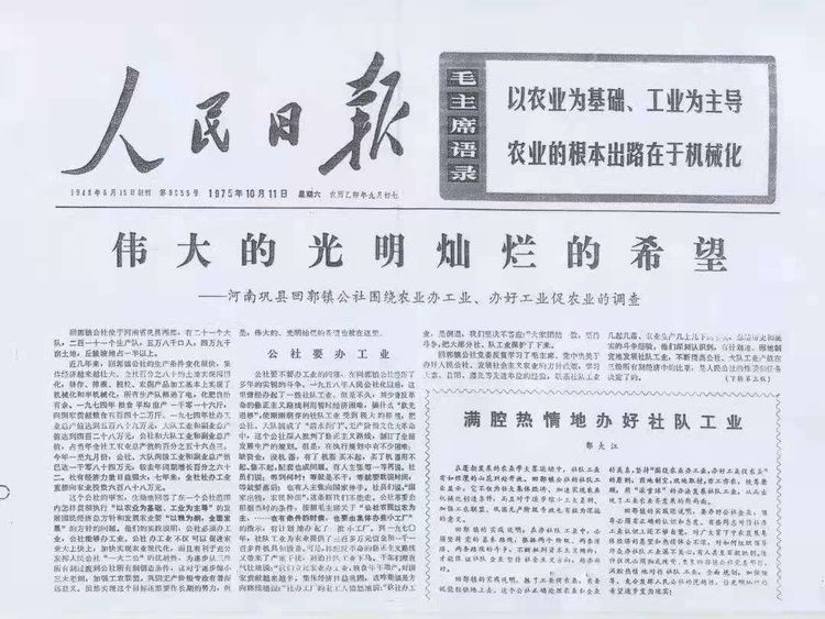 回郭镇自古以来交通便利,人口聚集,商业兴旺,在清代乾隆年间已是河南四大各镇之一。进入民国,回郭镇现代工商业迅速发展,享有“小上海”的美誉。五十年代末期,回郭镇开始兴办小钢铁,小煤矿,小机械,小水泥,小化肥“五小工业”,至七十年代,先后办起了诸多社队企业,成为全国“工业学大庆”先进单位。回郭镇“围绕农业办工业,办好工业促农业”的发展思路和率先发展社队企业的举措,受到上级领导的高度重视。1975年10月11日,《人民日报》头版头条刊发了长篇报道《伟大的光明灿烂的希望》,向全国宣传推广了回郭镇经验,对中国乡镇企业的发展起到了积极的引领,示范作用。