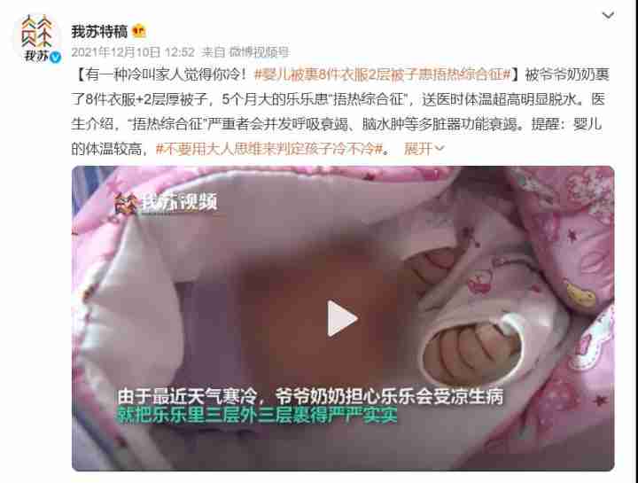 江苏一家爷爷奶奶,因为担心5个月的小婴儿受凉,里里外外裹了“8件衣服+2层厚被”,结果导致宝宝患上“捂热综合征”。送到医院的时候,婴儿呼吸急促,有明显脱水症状,体温出现超高温。