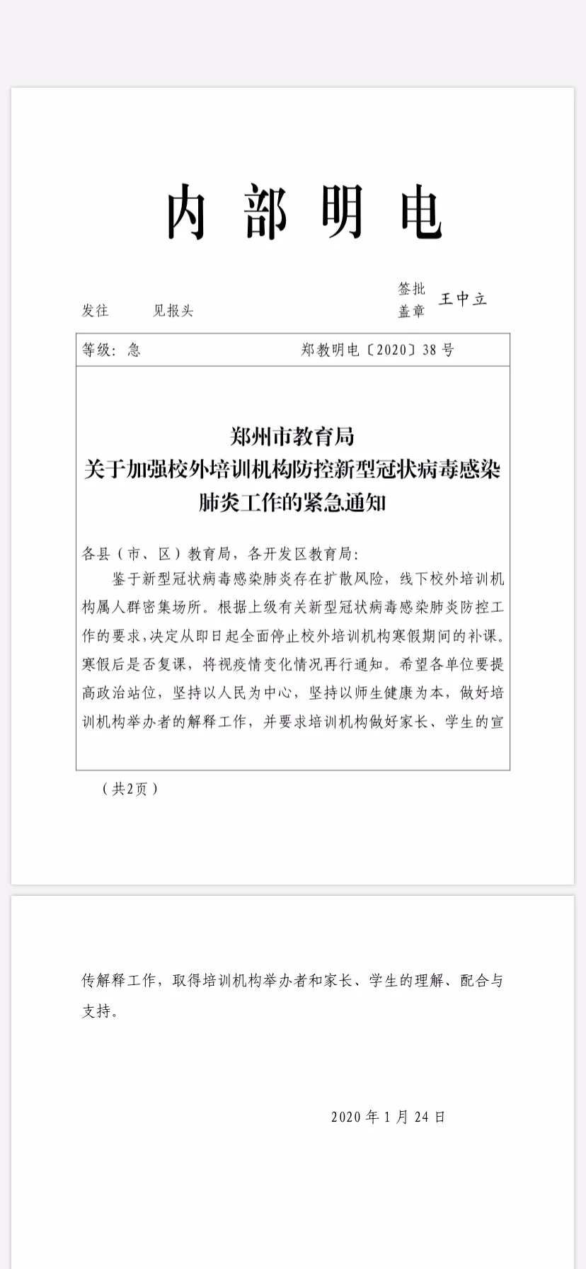 防控疫情,郑州的步伐一直没有停止!   1月24日,郑州市教育局发布了《关于加强校外培训机构防控新型冠状病毒感染肺炎工作的紧急通知》(以下简称《通知》),要求即日起全面停止校外培训机构寒假期间的补课。