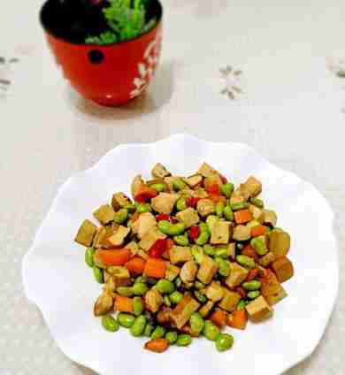 4、色拉油入锅,油热后爆姜末出香味,再倒入香干、枸杞子调味,煸炒少许时间,倾入毛豆,拌炒均匀,放入调料和适量高汤。收汤后,洒上松子拌匀,出锅。淋上麻油,盛入盘中放上装饰菜即成。